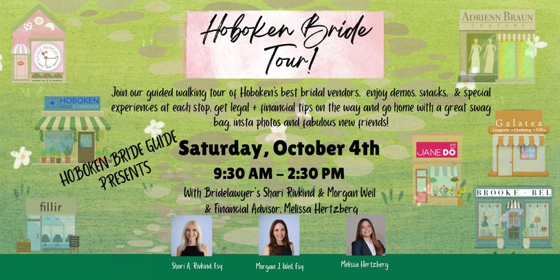 The Hoboken Bride Tour is a unique bridal walking tour through Hoboken’s best wedding resources. Together, we’ll explore six exclusive stops - from couture gowns to sparkling jewelry, skincare and wellness, fitness, and honeymoon fashion.
